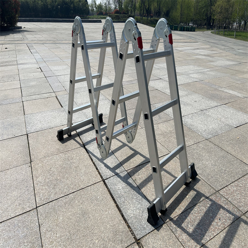 A strong and versatile folding ladder designed for home and job-site use. Made from durable aluminum, it offers a high weight capacity of up to 375 lbs (Type 1AA) and locks securely with reinforced hinges for safe operation. The 4×5 section design allows the ladder to transform into multiple working positions—straight extension, A-frame, scaffold base, or compact fold for storage.
